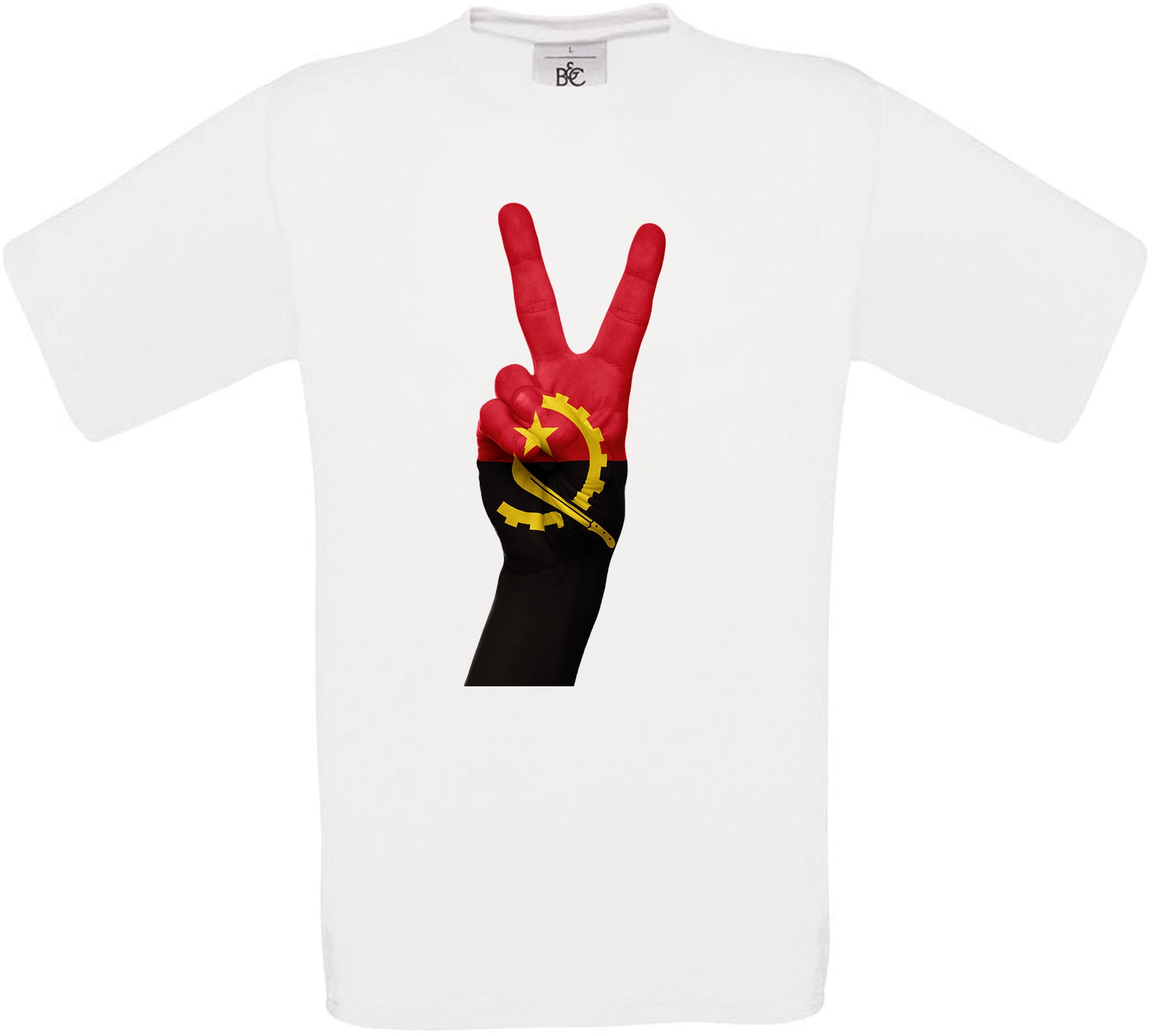 This t-shirt features Angola Two Fingers Flag