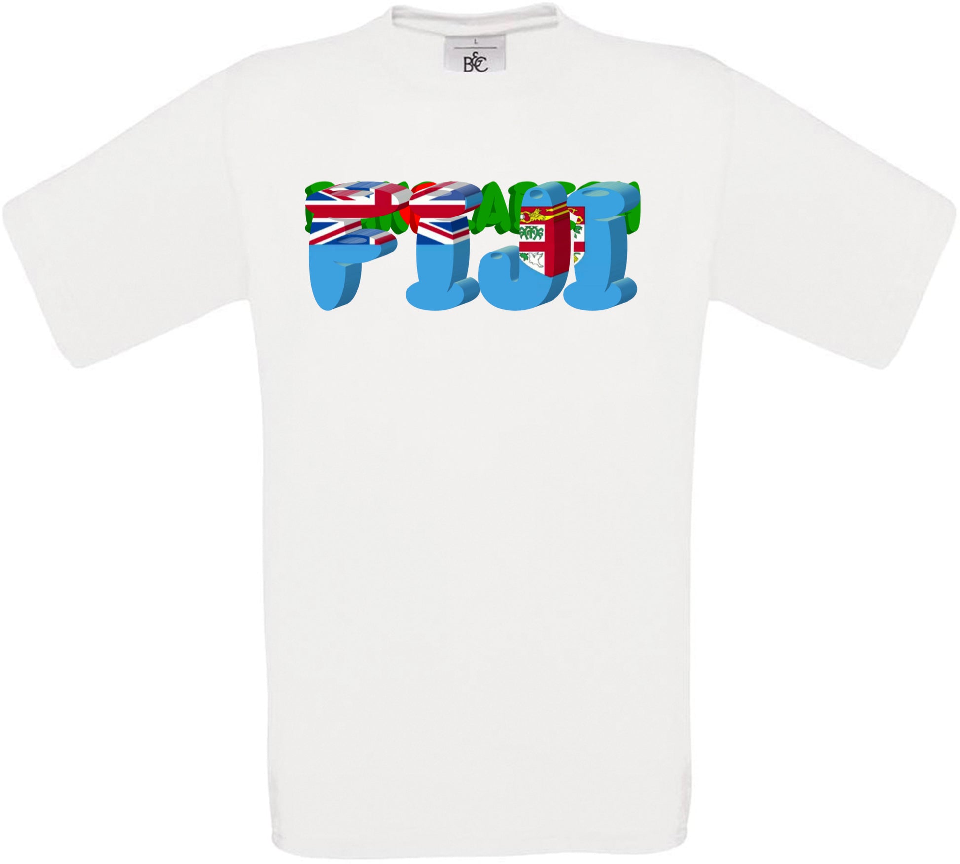 This t-shirt features Fiji Country Name Flag