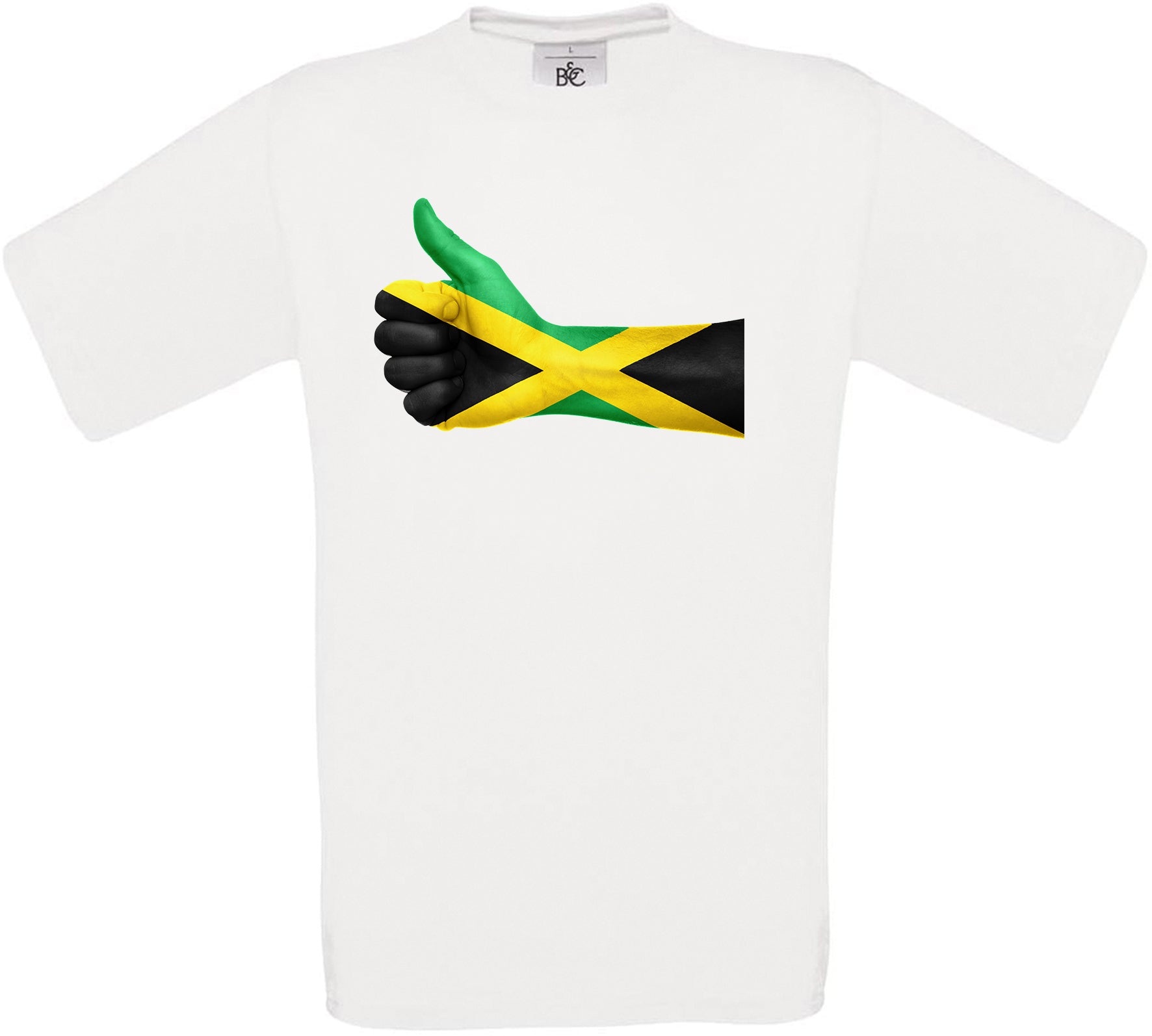 This t-shirt features Jamaica Thumbs Up Flag
