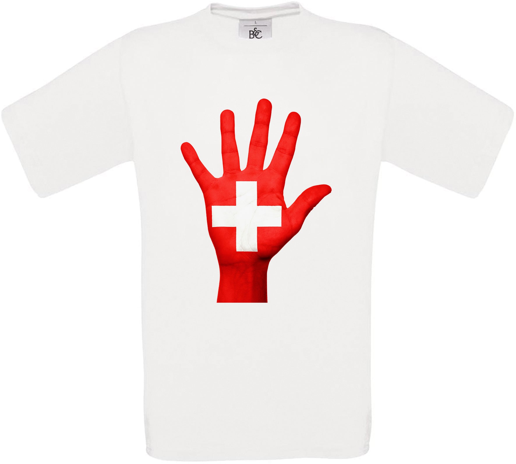 This t-shirt features Switzerland Hand Flag